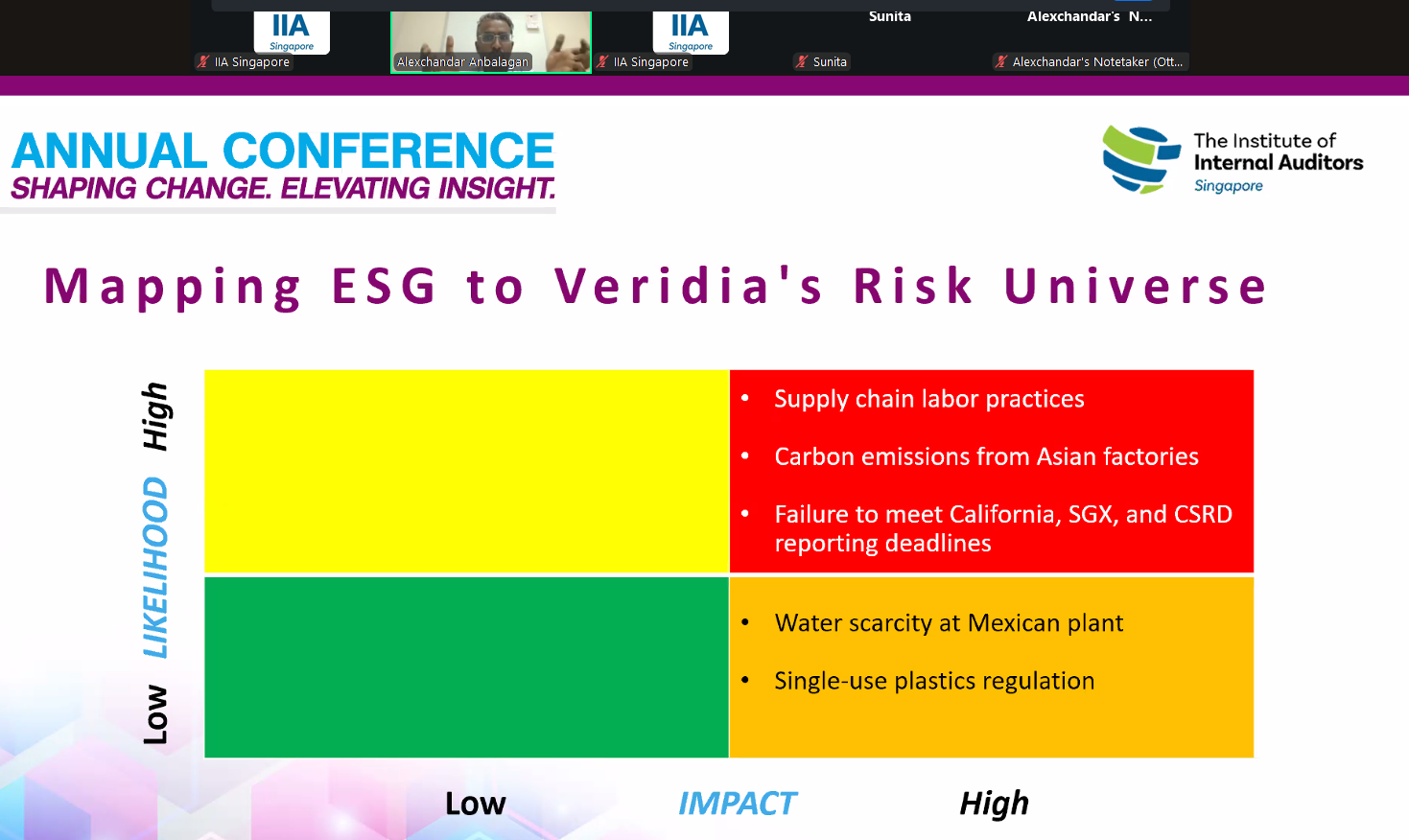 Extending the learning beyond the conference, participants received exclusive access to two post-event webinars addressing key developments in internal audit. On 22 October 2025, IIA Singapore Executive Director Richard Dyason presented “Risk in Focus 2026”, offering insights into the current risk landscape and its implications for internal audit programmes worldwide. This was followed on 29 October 2025 by “Beyond Compliance: Auditing ESG for Strategic Impact and Organisational Resilience”, conducted by Alexchandar Anbalagan, Chief Strategy Officer of TEASK, which explored how internal audit can strengthen assurance over ESG data and integrate sustainability considerations into audit planning.