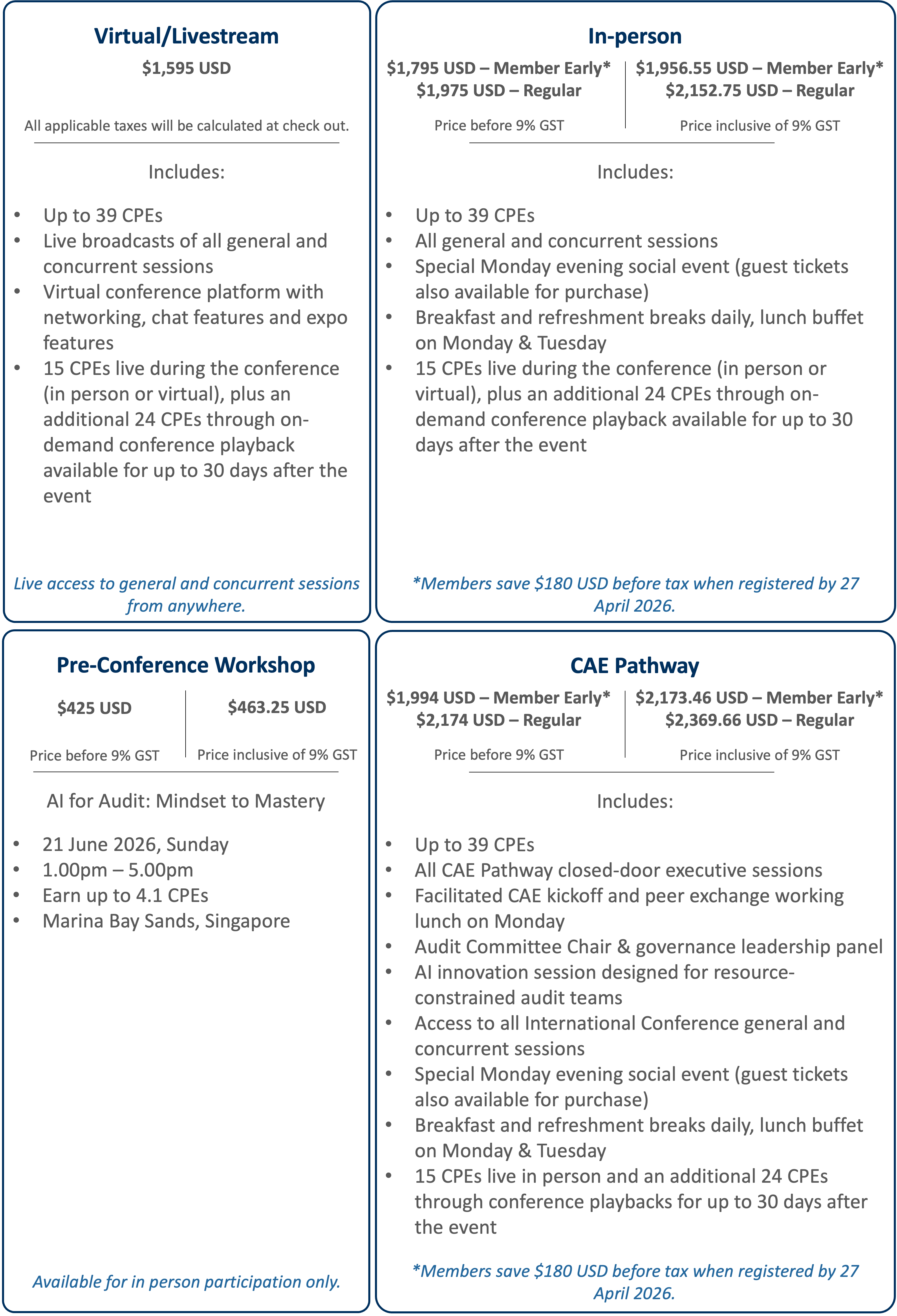 - Participants who register through IIA Singapore will enjoy a 10% discount. This offer is available for both in-person and virtual registrations.